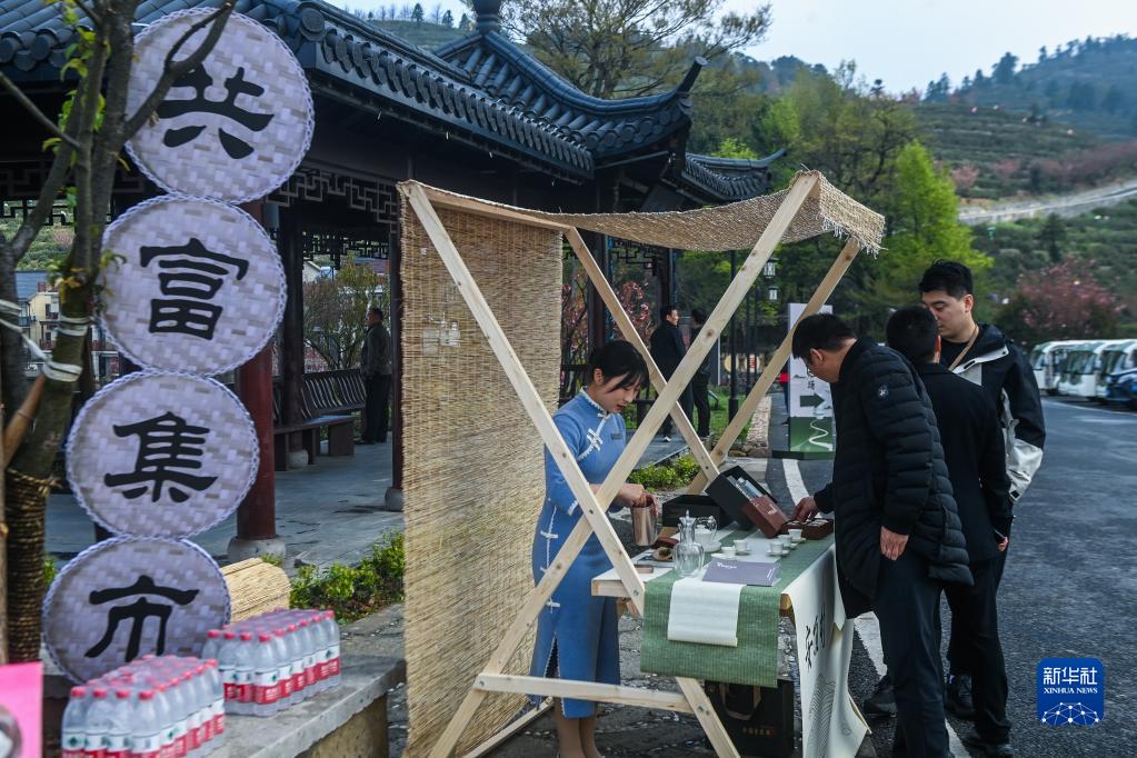 4月7日,工作人員在安頂村的春季共富集市上展示茶葉等當地土特產。