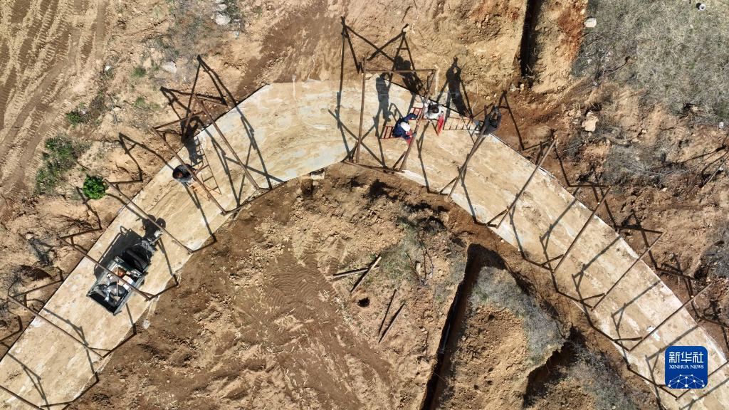 4月7日,在邢臺市信都區會寧鎮張爾莊村葫蘆生態種植園,村民在搭建葫蘆藤架(無人機照片)。