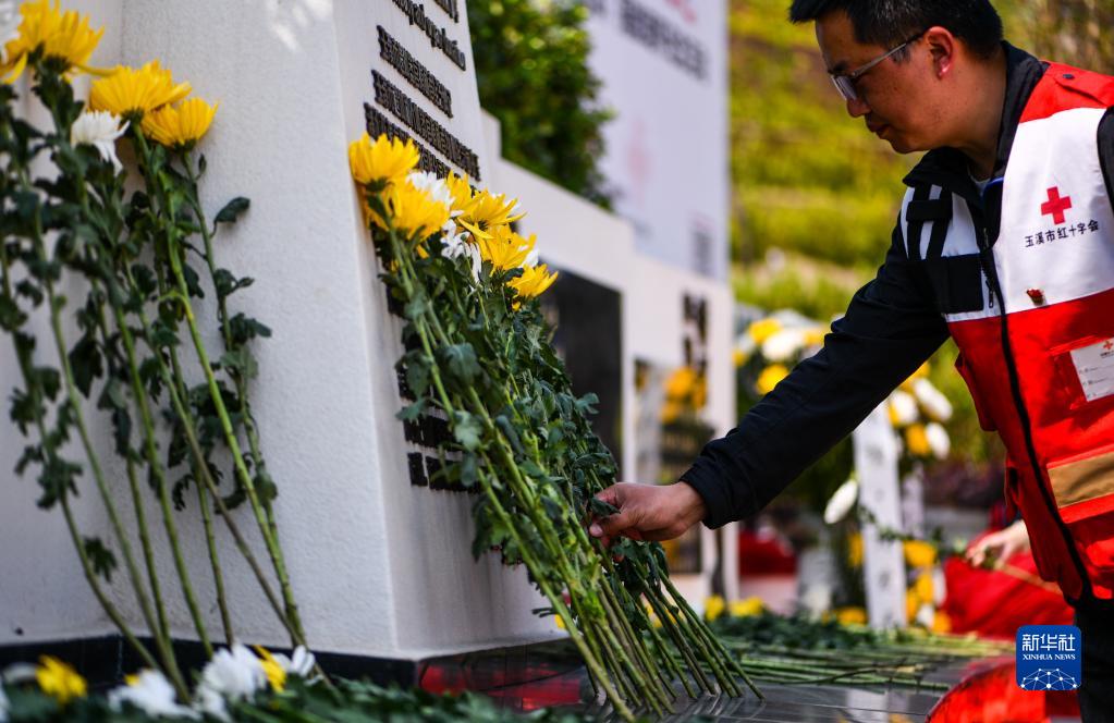 4月7日,參加活動的志愿者在現場獻花。