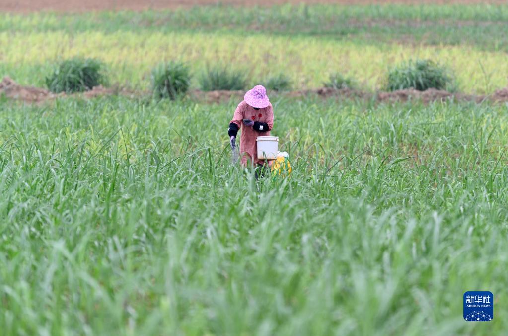 4月7日,在柳州市柳江區穿山鎮思榮村,農民在蔗田里忙碌。