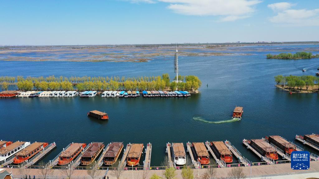 4月7日,處于試運營階段的白洋淀“水上巴士”項目畫舫船在白洋淀內行駛(無人機照片)。
