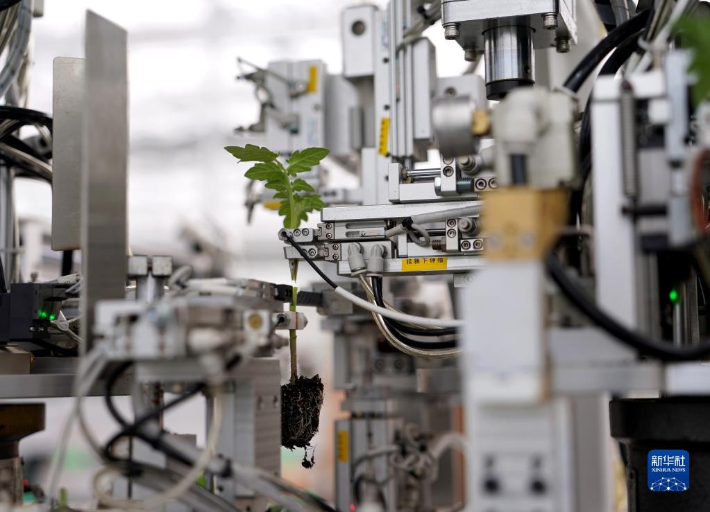 4月7日,在浙江省桐鄉市石門鎮的桐信種苗“未來農場”,農場研發的自動嫁接機在嫁接西紅柿苗。