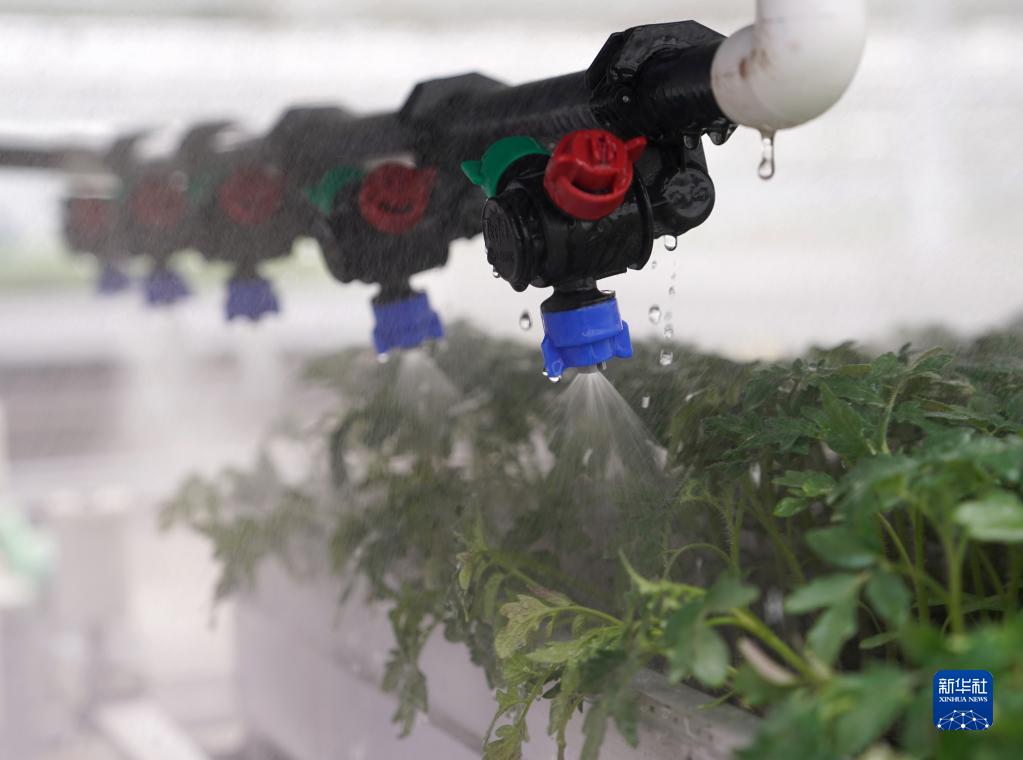 4月7日,在位于浙江省桐鄉市石門鎮的桐信種苗“未來農場”,噴灌車的噴頭為智能化物流苗床傳送過來的種苗澆水。