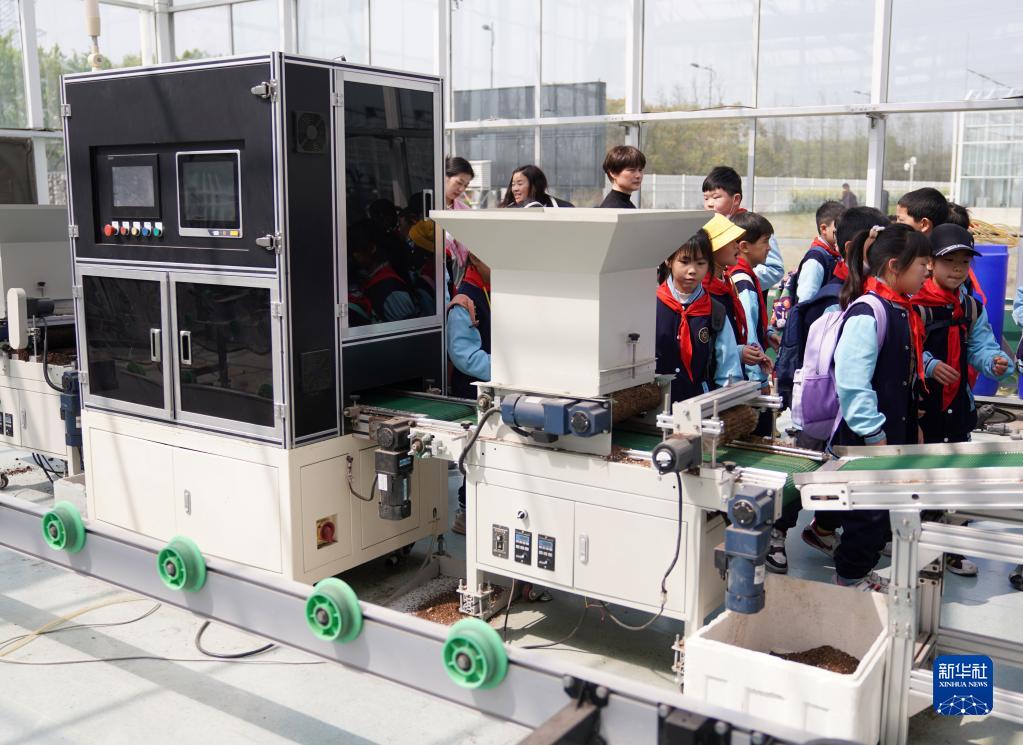 4月7日,在位于浙江省桐鄉市石門鎮的桐信種苗“未來農場”,開展研學活動的小學生參觀農場研發的智能精量播種機。