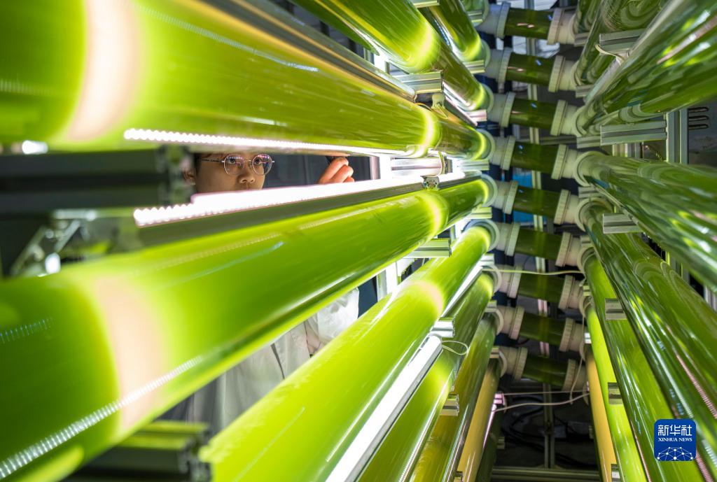 4月7日,在位于浙江省溫州市龍灣區圍墾南片的永興對蝦“未來漁場”,技術人員在藻類連續培養系統前測量光照強度。