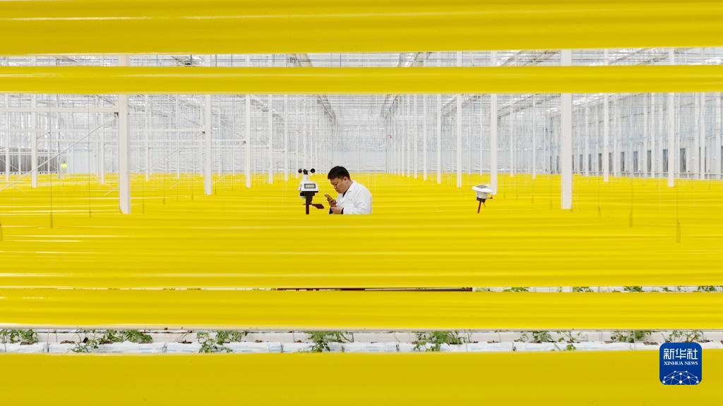 4月7日,在浙江省湖州市德清縣阜溪街道龍勝村水木“未來農場”,技術人員觀察番茄智能大棚光照數據(無人機照片)。