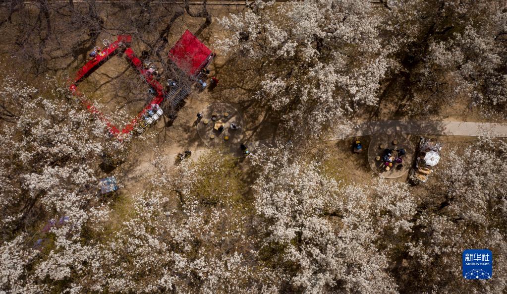 4月7日,游客在南長灘村賞花休閑(無人機照片)。