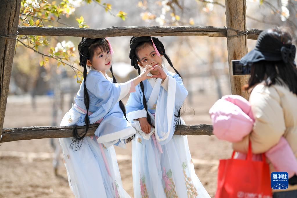 4月7日,家長帶著孩子在南長灘村的梨樹下留影。