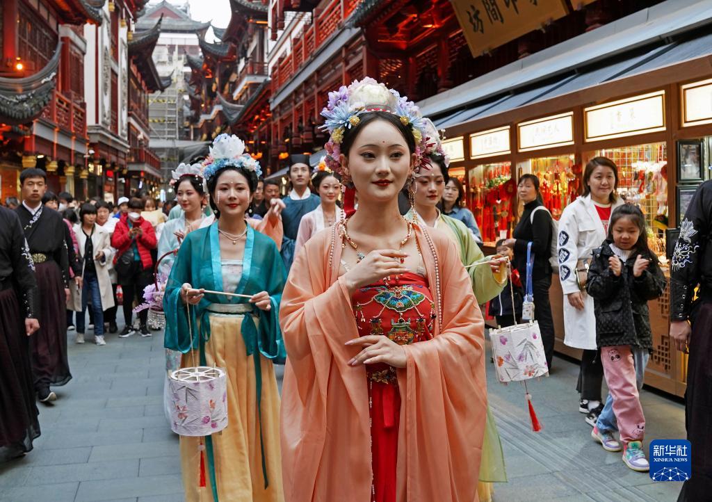 當日,上海豫園2023“仲春花朝節”沉浸式游園系列活動拉開帷幕。作為“節氣江南”系列活動之一,豫園“仲春花朝節”以古時花朝節為靈感,通過花車、巡游、市集、裝置等,讓游客感受國風韻味,暢游春日豫園。