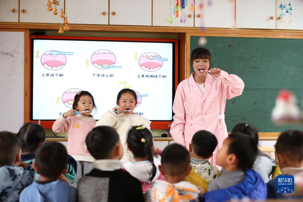 4月7日,貴州省黔東南苗族侗族自治州丹寨縣示范幼兒園的保健醫生向小朋友們示范正確的刷牙方式。