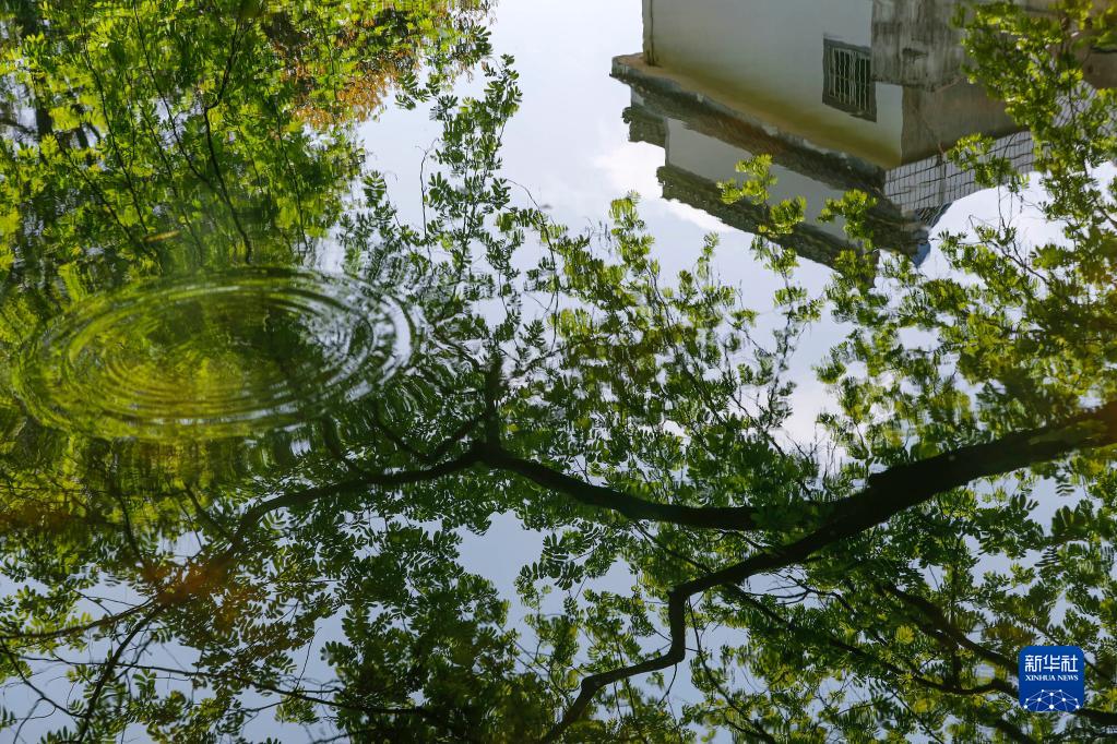 4月7日,在黃山市徽州區西溪南濕地拍攝的碧波倒影。