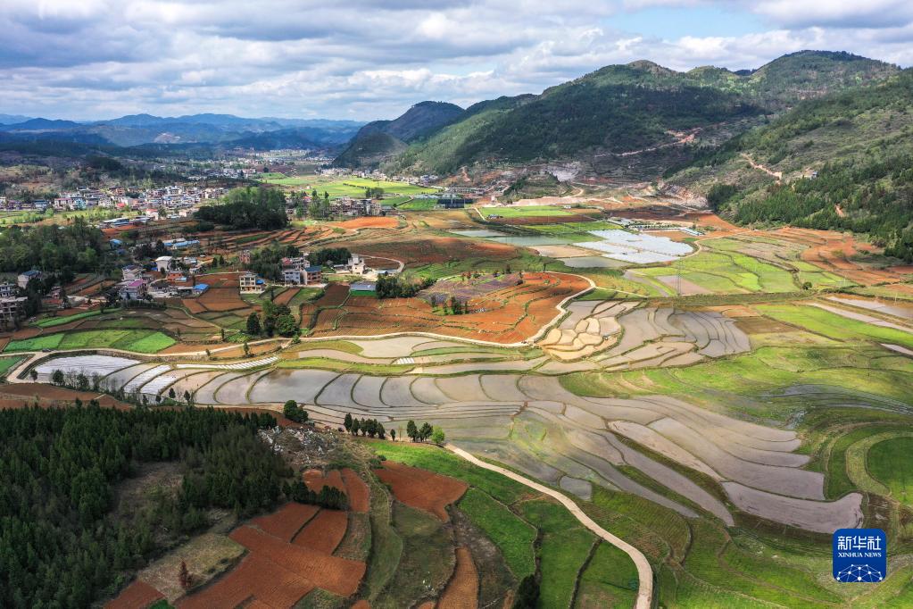 這是4月6日在貴州省岑鞏縣水尾鎮新場村拍攝的雜交水稻制種基地(無人機照片)。