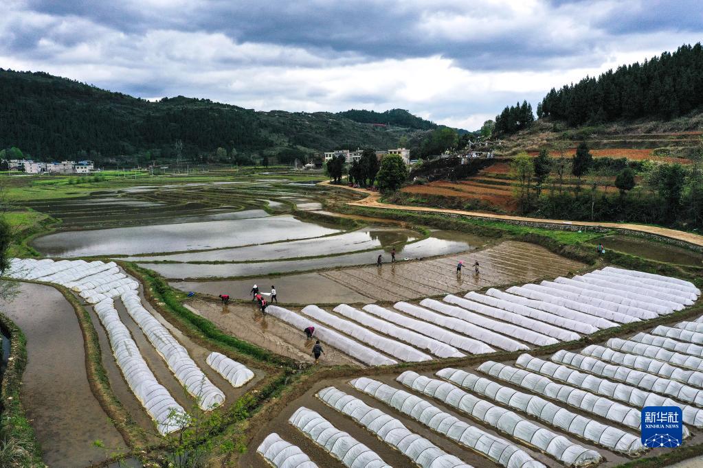 4月6日,村民在貴州省岑鞏縣水尾鎮新場村雜交水稻制種基地播種和覆膜(無人機照片)。