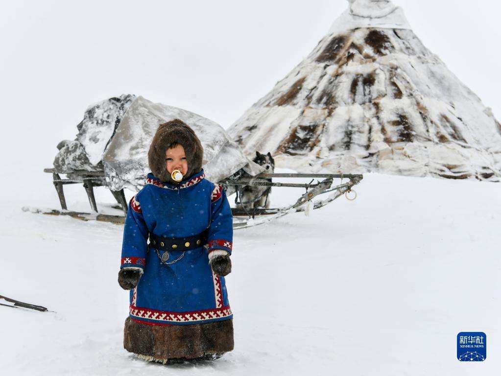 4月7日,在俄羅斯亞馬爾-涅涅茨自治區,一名涅涅茨兒童站在自家帳篷前。