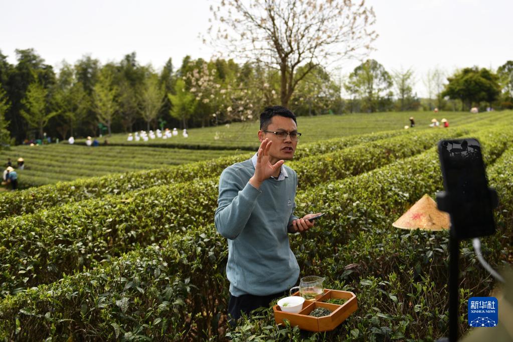 4月7日,工作人員在湖南省長沙市長沙縣金井鎮的金井茶旅融合產業園直播帶貨。