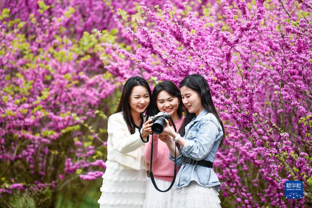 4月7日,游人在貴州省岑鞏縣天馬鎮玉門洞景區的紫荊花園賞花拍照。