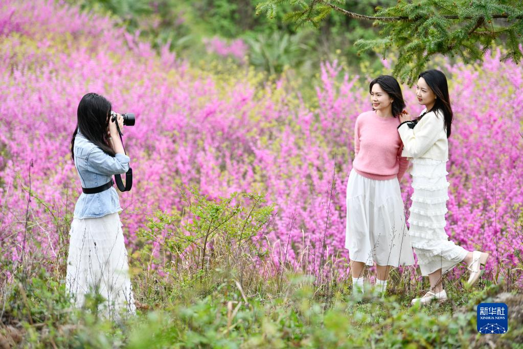 4月7日,游人在貴州省岑鞏縣天馬鎮玉門洞景區的紫荊花園賞花拍照。