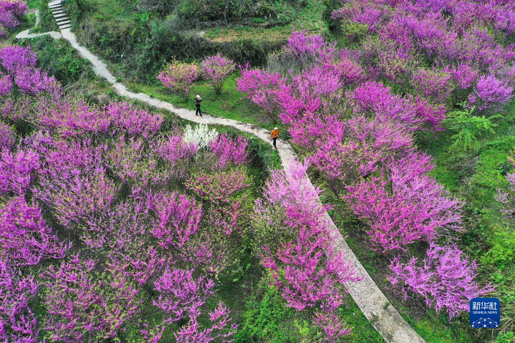 4月7日,游人在貴州省岑鞏縣天馬鎮玉門洞景區的紫荊花園賞花觀光(無人機照片)。