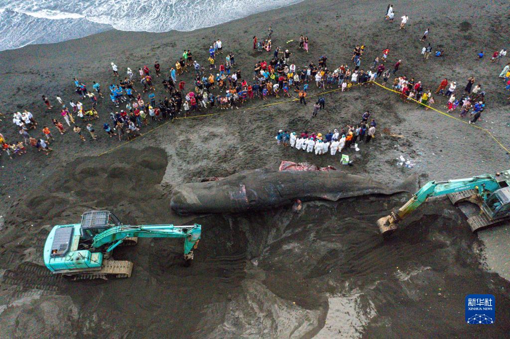4月6日,在印度尼西亞巴厘島克隆孔,工作人員操作挖掘機準備埋葬抹香鯨的遺體(航拍照片)。