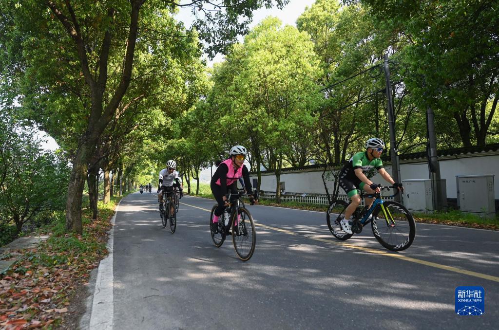 4月8日,騎行愛好者在浙江省諸暨市趙家鎮香榧國家森林公園參加健身騎行活動。
