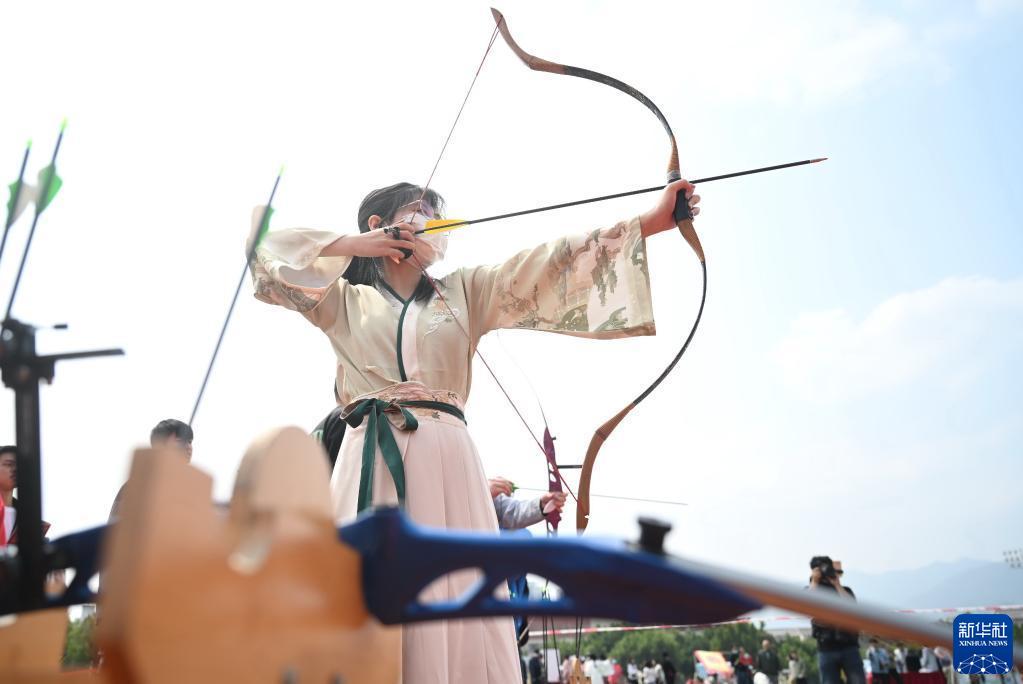 4月8日,學生在福州大學城“優秀傳統文化進校園”開幕式上體驗射箭。