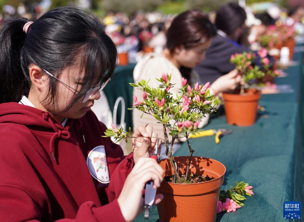 4月8日,嘉興職業技術學院學生在開幕式現場進行杜鵑造型技藝展示。