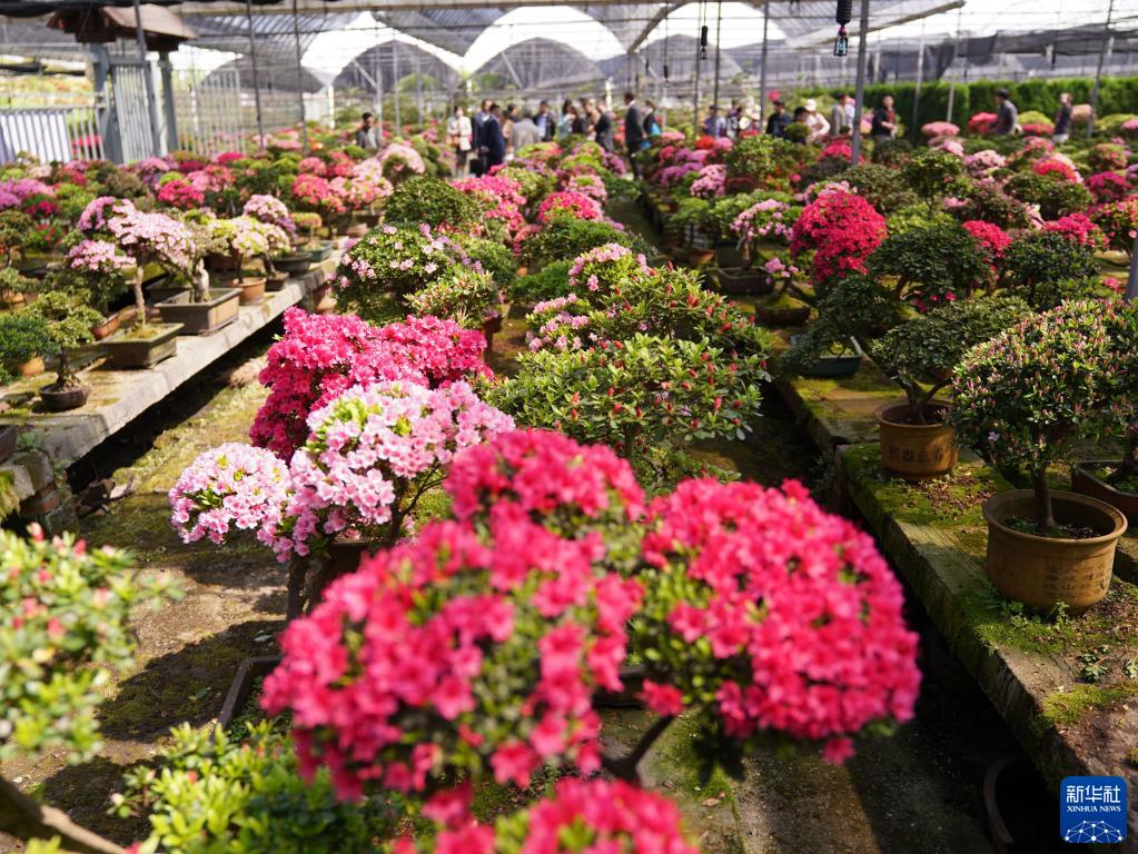 4月8日,游客在嘉善縣大云鎮碧云花園的精品杜鵑盆景坊內參觀。