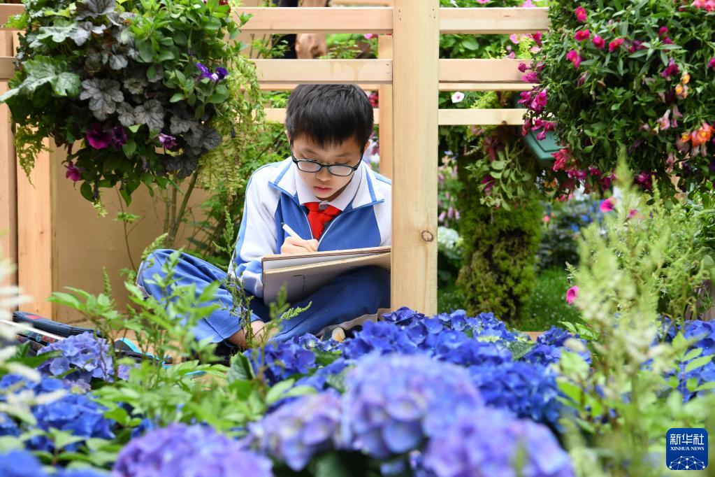 4月8日,在2023粵港澳大灣區花展現場,一名小朋友在寫生。