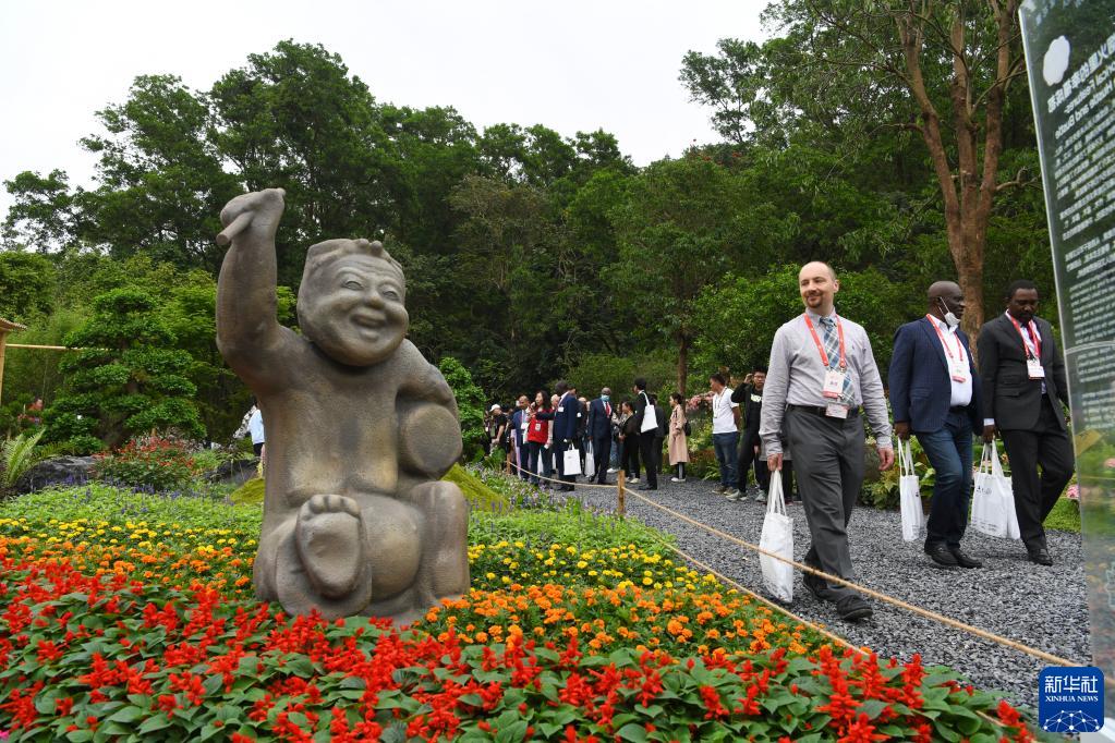 4月8日,外國嘉賓觀賞2023粵港澳大灣區花展作品《文脈傳承——煙火里的幸福成都》。