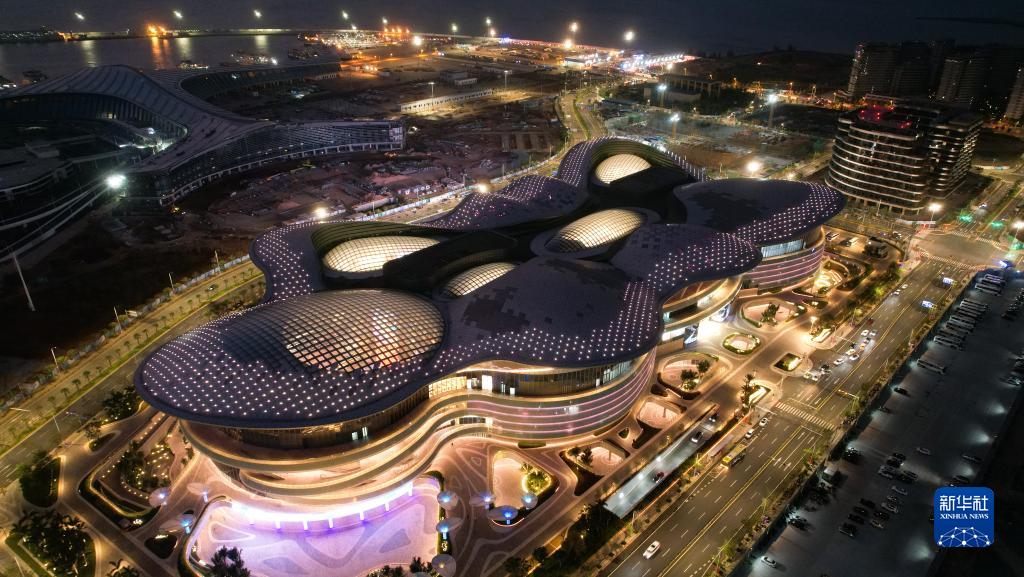 夜色中的??趪H免稅城(4月4日攝,無人機照片)。