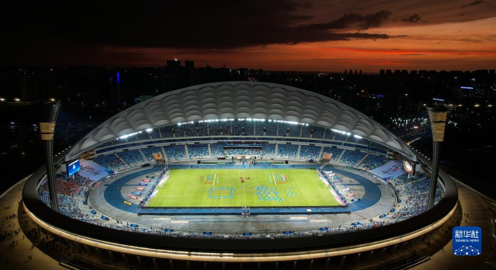 2022年6月3日,2022賽季中國足球協會超級聯賽開幕式在??谖逶春芋w育場舉行(無人機照片)。