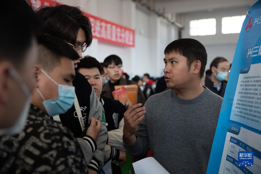 4月8日,在黑龍江工商學院松北校區體育館,求職者與用人單位工作人員交談。
