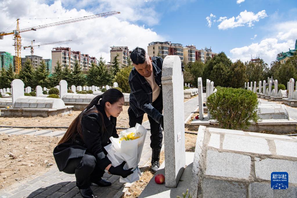 在拉薩烈士陵園,索朗拉姆和父親桑珠為無名烈士掃墓(4月5日攝)。