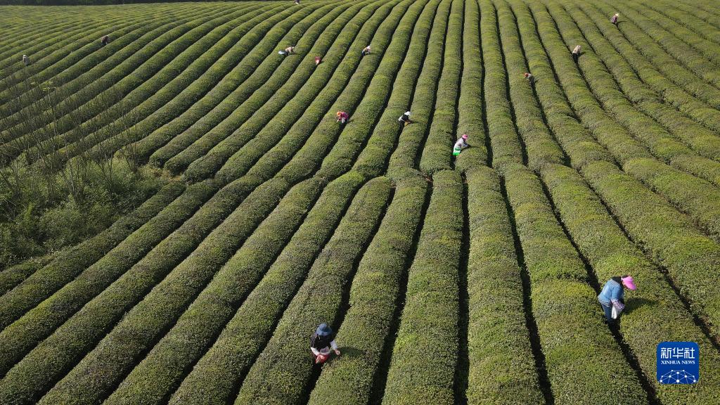 4月7日,采茶工在敬亭山山腳下的一處茶園里采茶(無人機照片)。