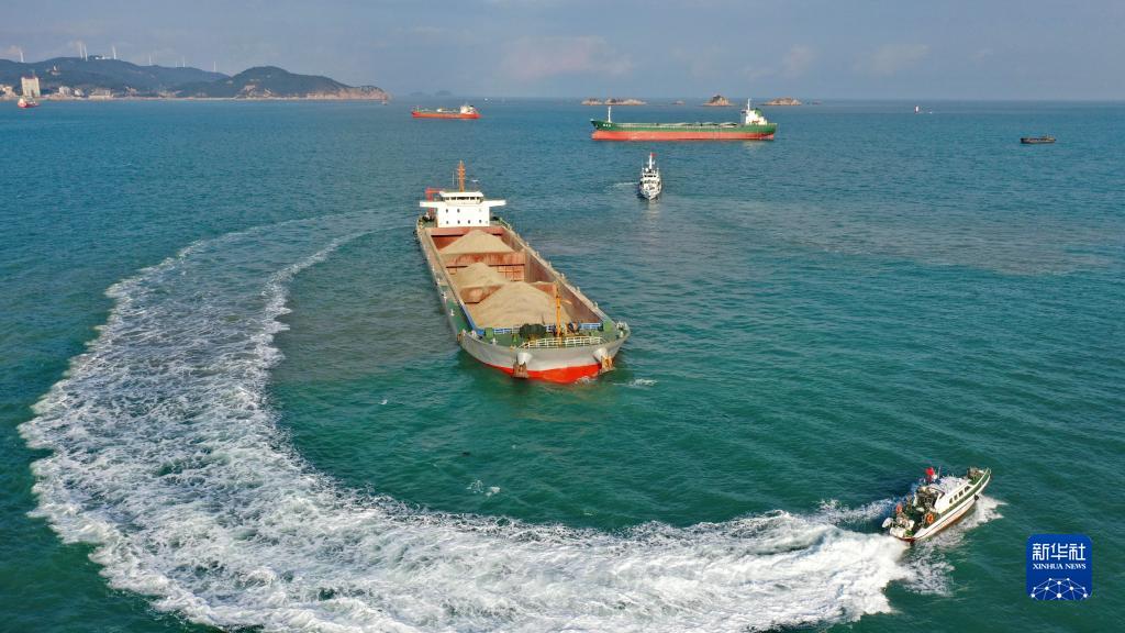 福建福州海警局執法員利用無人機進行航拍監控,艦艇協同配合,在轄區海域攔截可疑船舶(2021年11月30日攝,無人機視頻截圖)。