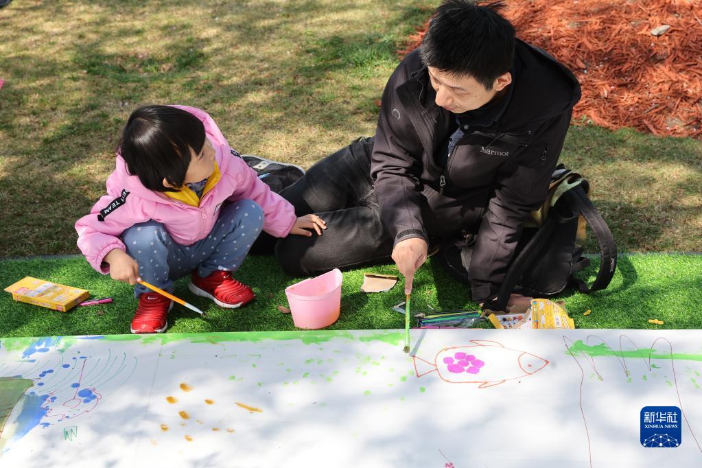 4月8日,家長和孩子在上海市寶山區顧村公園“櫻畫書藝”活動上創作。