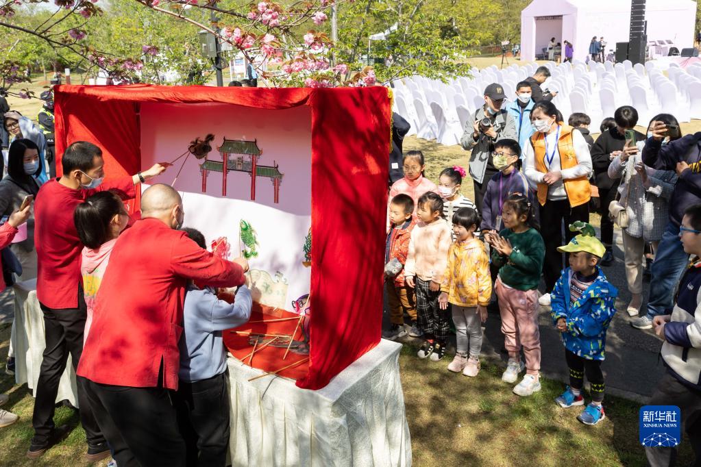 4月8日,孩子們在上海市寶山區顧村公園參加皮影戲現場體驗活動。