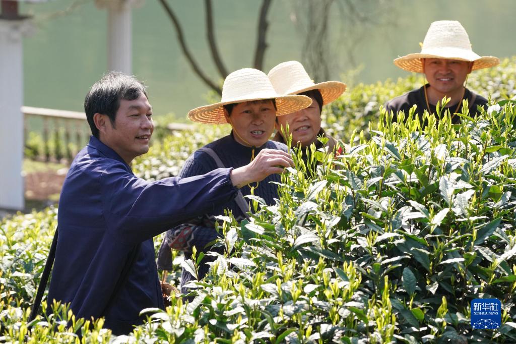 4月8日,在黃山市黃山區新明鄉猴坑村茶園,國家級非遺項目太平猴魁制作技藝代表性傳承人方繼凡(左一)在了解茶葉品質。