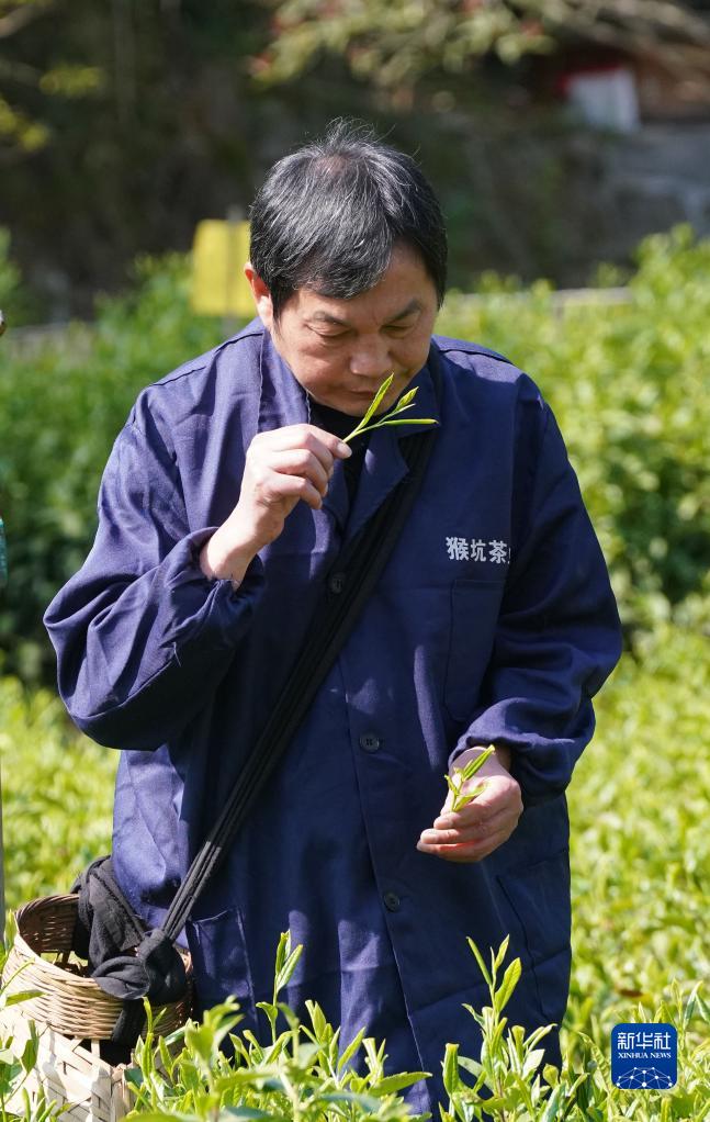 4月8日,在黃山市黃山區新明鄉猴坑村茶園,國家級非遺項目太平猴魁制作技藝代表性傳承人方繼凡在觀察茶葉品質。