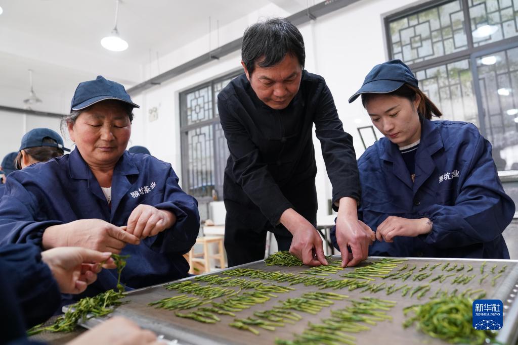 4月8日,在黃山市黃山區新明鄉猴坑村,國家級非遺項目太平猴魁制作技藝代表性傳承人方繼凡(右)指導員工對試采的早熟茶進行理條。