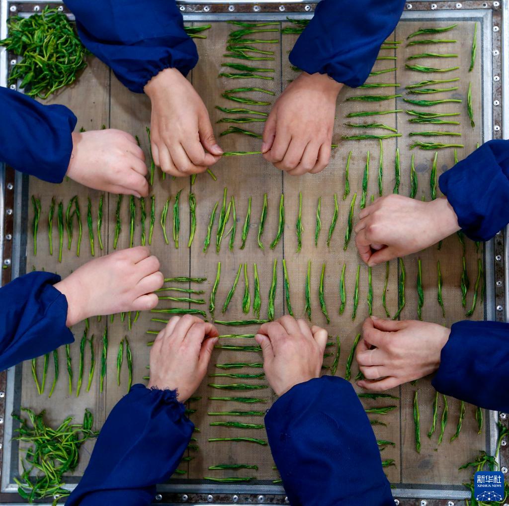 4月8日,黃山市黃山區新明鄉猴坑村生態茶園的茶工將殺青后的太平猴魁捏尖。