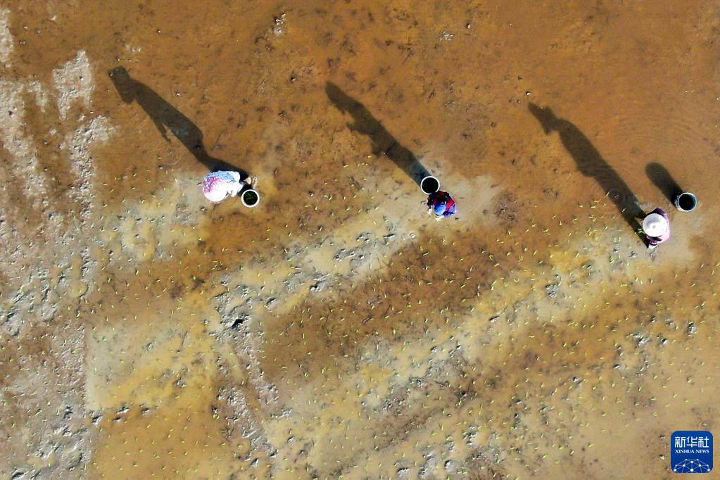 4月8日,江西省吉安市峽江縣水邊鎮義橋村的農民在田間拋秧(無人機照片)。