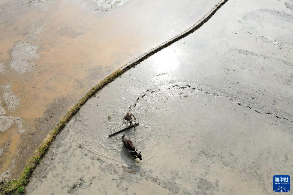 4月8日,在湖南省婁底市雙峰縣井字鎮花橋村,農民趕著耕牛平整水田(無人機照片)。