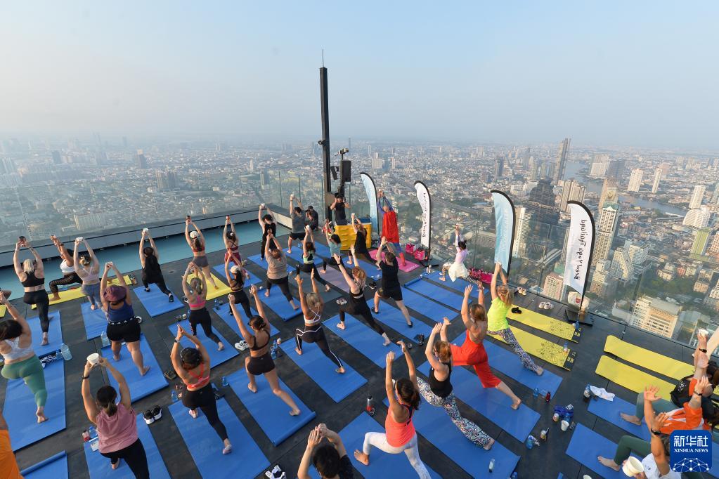 當日,數十名瑜伽愛好者在曼谷王權云頂大廈頂層觀景平臺體驗高空瑜伽。