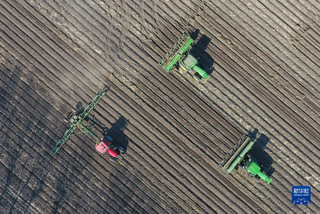 4月8日,在位于黑龍江省北安市的北大荒集團建設農場有限公司一處農田,大型拖拉機在進行分層定量施肥與鎮壓保墑作業(無人機照片)。