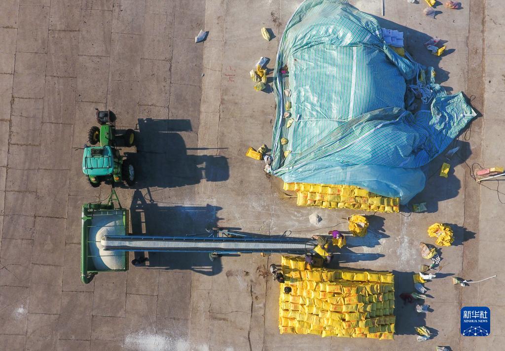 4月8日,在位于黑龍江省北安市的北大荒集團建設農場有限公司,拖拉機在裝運肥料(無人機照片)。
