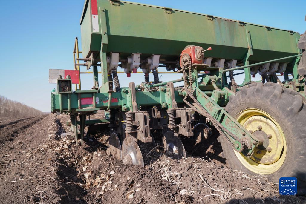 4月8日,在位于黑龍江省北安市的北大荒集團建設農場有限公司一處農田,大型拖拉機在進行分層定量施肥作業。