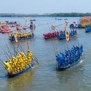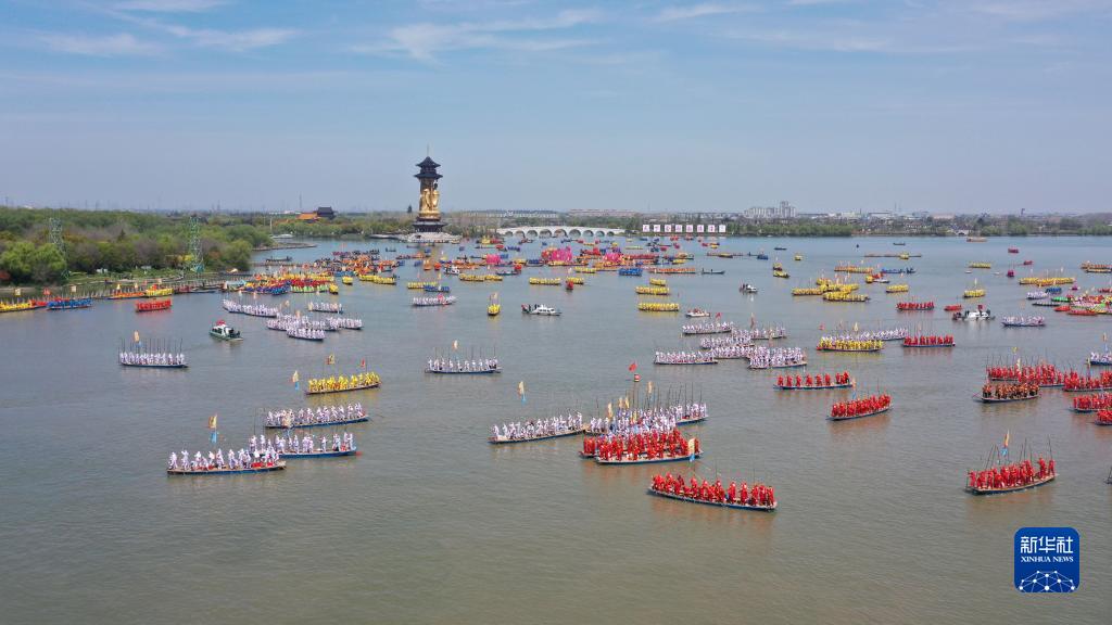當日,2023年泰州姜堰溱潼會船節在江蘇省泰州市姜堰區溱湖國家濕地公園開幕,數百條船只和萬余名會船選手云集溱湖,演繹歷久彌新的民俗畫卷。