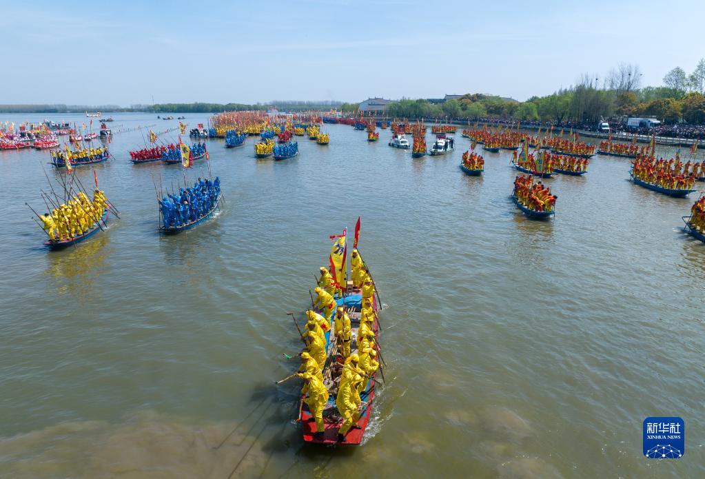 當日,2023年泰州姜堰溱潼會船節在江蘇省泰州市姜堰區溱湖國家濕地公園開幕,數百條船只和萬余名會船選手云集溱湖,演繹歷久彌新的民俗畫卷。
