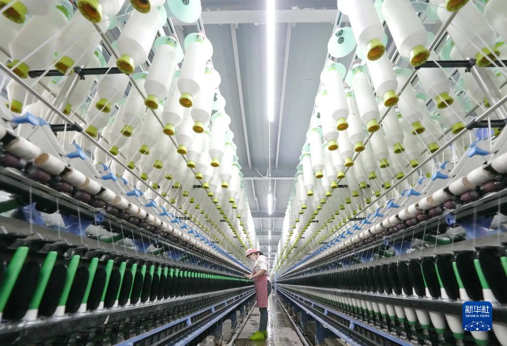 4月9日,工人在河北省青龍滿族自治縣朱杖子鄉朱杖子村一家紡織企業生產車間工作。